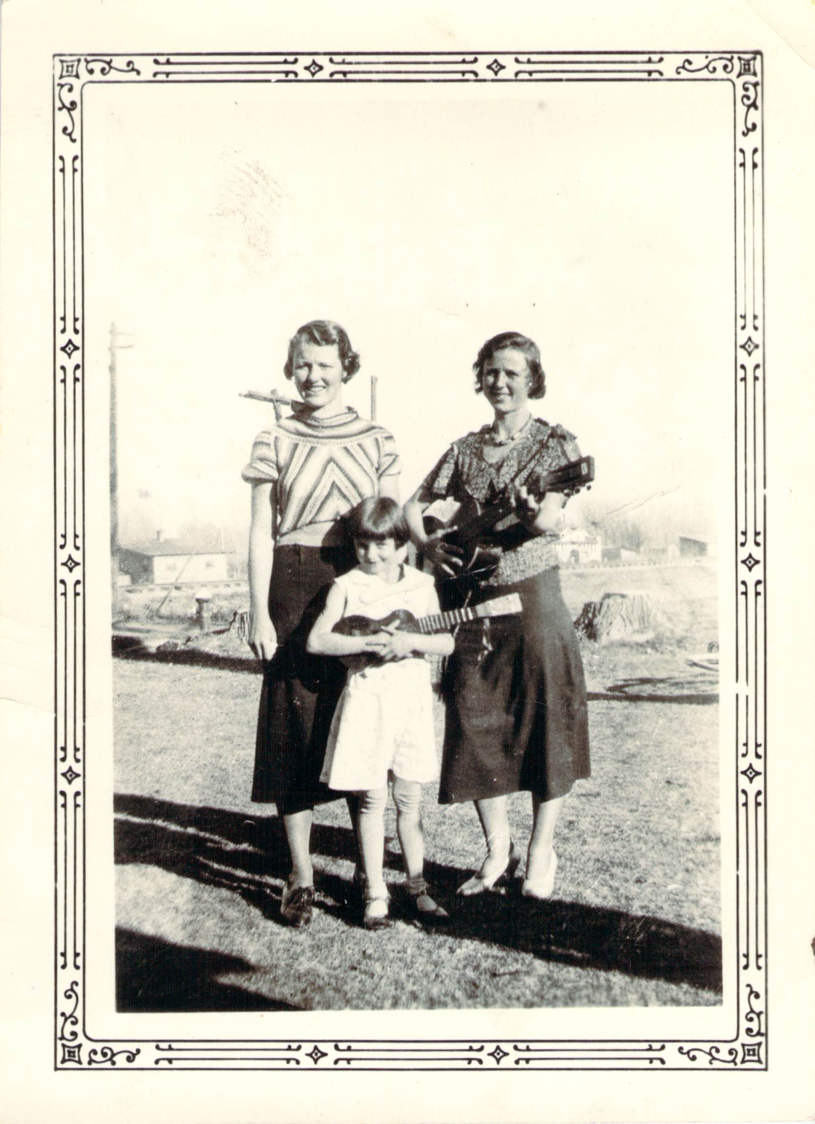 Wanda, Lorraine, Marie in front yard of Arthur and Teresa home on Meridian street in Blackfoot. Marie and Lorraine are holding guitars. 1931 or 1932. Picture taken from Aunt Wanda’s book.